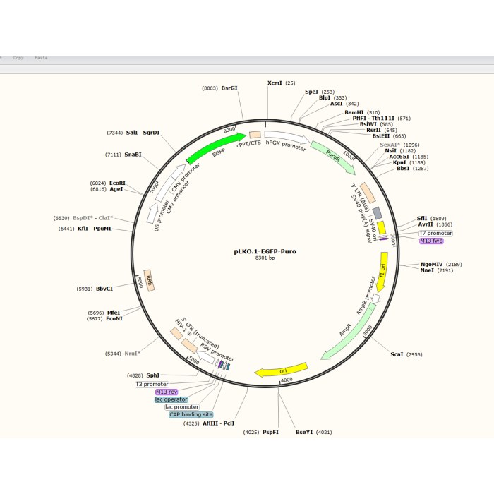 质粒简介:   pLKO.1-EGFP-Puro是一个哺乳细胞慢病毒干扰RNA质粒。