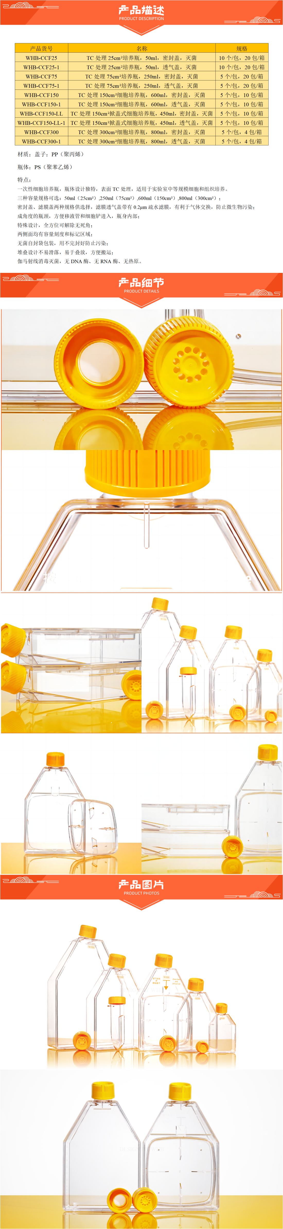 ¥180.00WHB WHB-CCF150-LL TC处理150cm²掀盖式细胞培养瓶,450ml,密封盖,灭菌