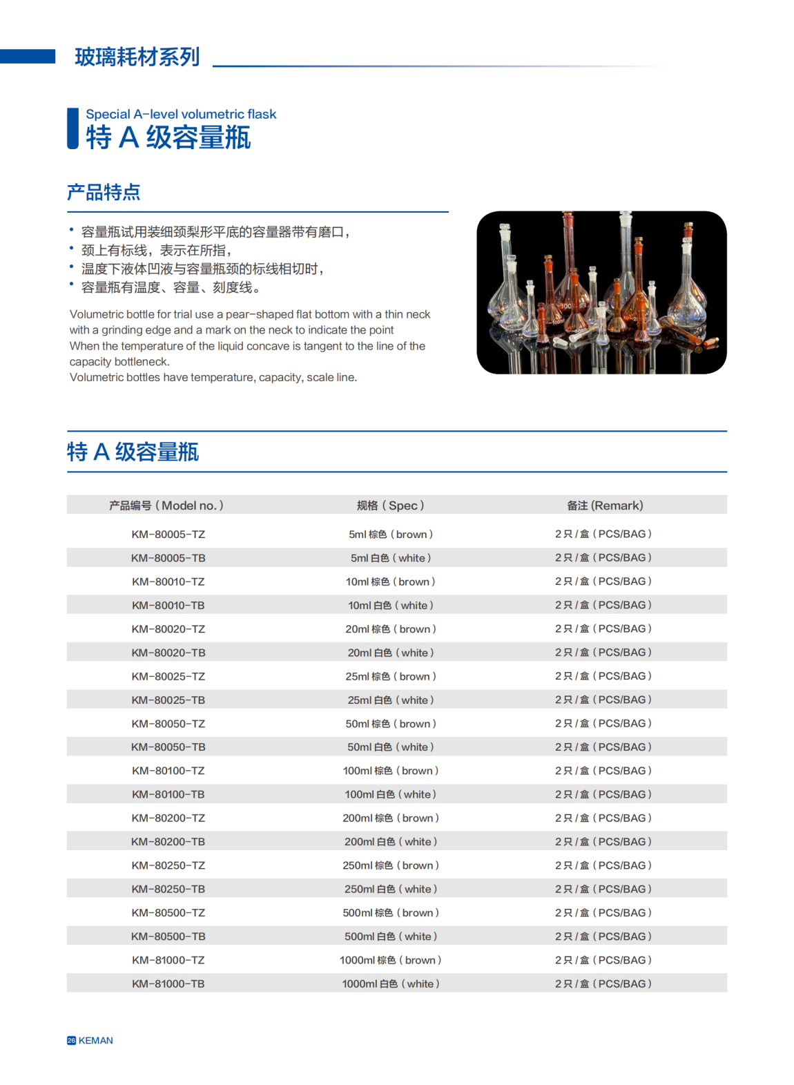 ¥135.00科曼 KM-80025-TZ 25ml(棕色) 容量瓶